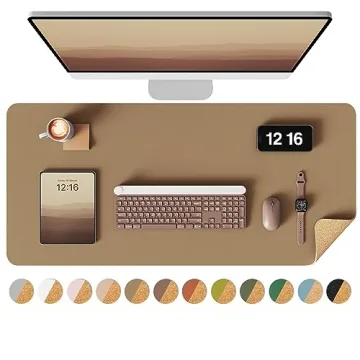 Show more Discover the perfect blend of style and functionality with the YSAGi Double-Sided Desk Pad, designed to elevate your workspace while providing unmatched durability and elegance. Measuring at 31.5" x 15.7", this versatile desk mat is crafted from premium PU leather and eco-friendly cork, which gives it a luxurious feel while being sustainable. With the ability to switch between its chic leather side and the natural texture of cork, it accommodates any aesthetic preference, making it an indispensable addition to both home and office settings.