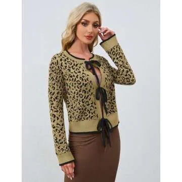 Show more Introducing the ultimate fashion statement for this season – the stunning Women's Leopard Bow Cardigan Sweater, meticulously crafted to enhance your wardrobe. Made from premium quality knit fabric, this cardigan provides a super soft touch, ensuring it’s both skin-friendly and breathable. Its lightweight design offers a comfortable and trendy wearing experience that you won’t want to miss. Stand out with its classic leopard pattern, complemented by a cute tie-up bow knot in the front, adding a dash of charm and sophistication to any outfit.