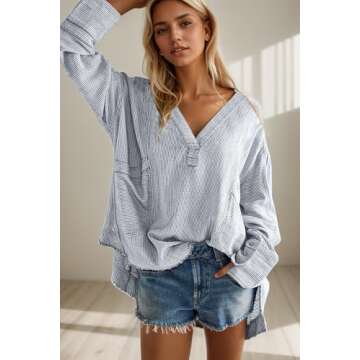 Ythomm Women Striped Oversized T-Shirts Long Sleeve Deep V Neck Pullover Tunic Tee Tops Vintage Casual Loose Side Slit Blouse Blue, X-Large