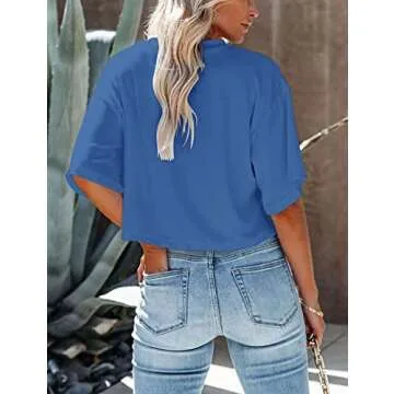 Yuccalley Women's Summer Crop Tops Short Sleeve Round Neck T-Shirt Basic Tees (Blue, Medium)