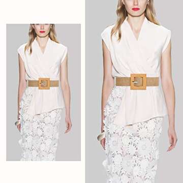 YUCFOREN Women Skinny Dress Belt, Fashion Straw Woven Elastic Stretch Waist Band Wood Buckle Belt