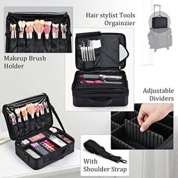 Yueieoun 2-In-1 Professional Rolling Makeup Case, Makeup Organizer Trolley with Make up Train Case, Soft Sided Cosmetology Travel Cases with 4 Drawers, Brush Holders, Black Nylon