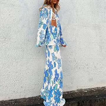 Yuemengxuan Women 2Pcs Casual Outfits Set Button Down Long Sleeve Shirt High Waist Pleated Pants Sets Streetwear Loungewear (Blue Floral, Small)