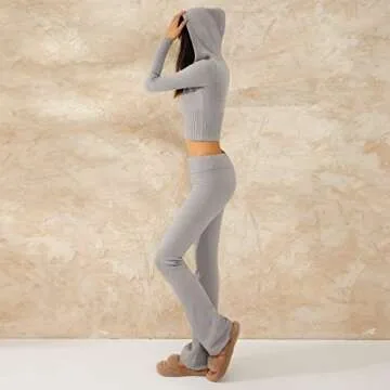 Yuemengxuan Women's 2 Piece Outfits Ribbed Knit Sweatsuit Long Sleeve Zip Up Hooded Sweater High Waist Flare Pants Tracksuit Lounge Sets, Grey, Large