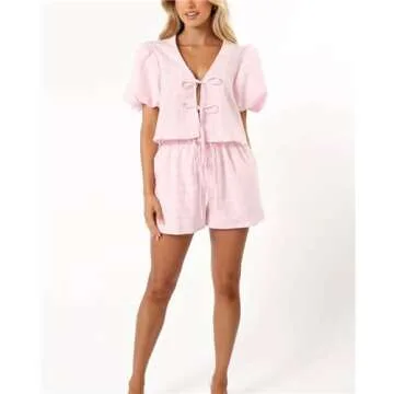 Show more Step into comfort and style with the Yuemengxuan Women Y2k Peplum Shirt Shorts Set, a charming two-piece lounge set designed for modern women who value both fashion and functionality. Crafted from a blend of 35% cotton and 65% polyester, this ensemble is soft, breathable, and lightweight, ensuring you stay cool and comfy throughout the day. The trendy Y2k-inspired design features an adorable puff sleeve and a chic tie front on the V-neck shirt, paired perfectly with high-waisted plaid shorts. Available in a delightful shade of pink, this set not only caters to your loungewear needs but also makes a stylish statement for various occasions.