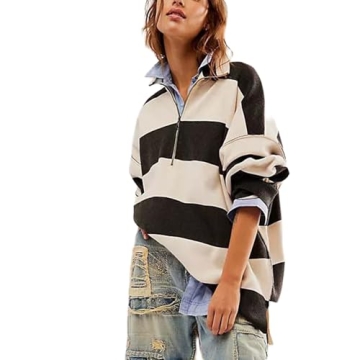 Show moreElevate your autumn wardrobe with the Yuemengxuan Women Y2k Striped Sweatshirts Quarter Zip Pullover Sweater, a stylish blend of comfort and trendy design. This oversized sweatshirt showcases a chic 1/4 zip v-neckline that not only enhances your look but also allows for easy wear and ventilation. With dropped shoulders and long sleeves complemented by knit cuffs, it promises to keep you warm and cozy as the cooler months approach. The striped pattern adds a touch of playfulness, making this sweater a versatile addition to any outfit.