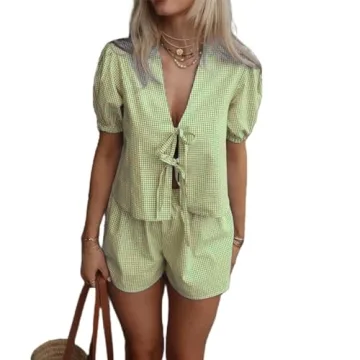 Yuemengxuan Women Y2k Two Piece Plaid Lounge Sets Puff Sleeve Tie front Blouse Top High Waist Shorts Casual Pajamas Sets (Emerald Green #lJR6, M)