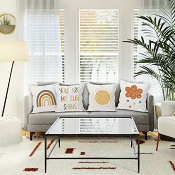 Show moreIntroducing the YUESHARE Boho Watercolor Rainbow Sun Cloud Rain Throw Pillow Covers, a vibrant and heartwarming addition to any nursery or kid's room decor. Emblazoned with the heartfelt phrase "You Are My Sunshine," these linen pillow covers come in a charming set of four, each measuring 18 x 18 inches. Crafted with high-quality fade-resistant material, these covers are not only visually appealing but also durable, ensuring that they will withstand the test of time, making them perfect for children's spaces. Transform your abode into a cozy retreat filled with warmth and positivity through these beautifully designed pillows that encapsulate the spirit of childhood joy and imagination.