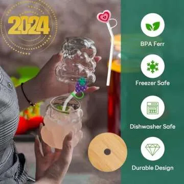 YUHANOER Christmas Glass Cups with Bamboo Lids and Glass Straw&Straw Cover 2pcs Set-12oz Grape Shaped Drinking Glasses for Smoothie Cup,Beer,Iced Coffee,Juice glasses,Cocktail,Whiskey Christmas gifts