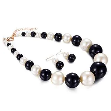 Yuhuan Womens Faux Big Pearl Choker Necklace and Earring Set Fashion Pearl Set (Black and White)
