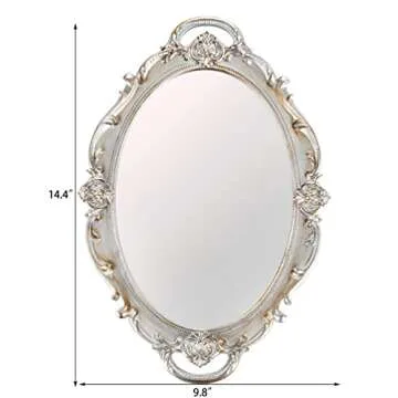 Show moreIntroducing the Yujiko Mirrored Tray – an exquisite blend of functionality and elegance. This multi-purposed decorative tray is not just a storage solution but a versatile accent piece for your home. With its stylish brass plating and antique finish, it serves as the perfect organizer for your perfumes, cosmetics, and jewelry, transforming clutter into chic displays. Measuring 9.8 inches by 14 inches, it boasts a generous size that easily accommodates all your beauty essentials while maintaining a stylish presence on your vanity or dresser.