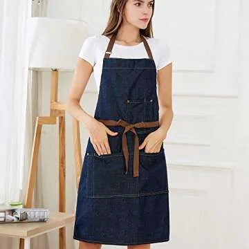 YukaBa Blue Adjustable Denim Jean Kitchen apron with 5 Pockets for Women Men Optimized upgrade(Denim) (Set of 1)