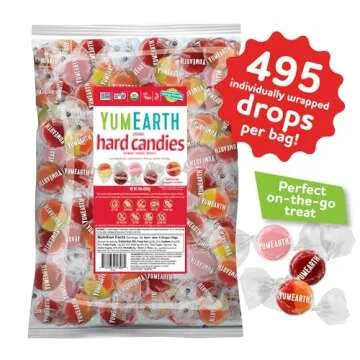 Show moreDiscover the delightful taste of the YumEarth Organic Fruit Drops Variety Pack, where every bite transports you to a fruity paradise! This 56 oz. bag is filled with Individually Wrapped Lollipops that are not just a treat for the palate but also a celebration of health. With flavors like Strawberry, Pomegranate, Peach, Cherry, Mango, and Watermelon, each lollipop is a burst of natural sweetness designed to satisfy your candy cravings without the guilt. Crafted with real fruit and vegetable juices, these lollipops bring you an authentic taste experience without any artificial ingredients. Whether you're organizing a birthday party, planning a school event, or simply want to indulge in a sweet treat, YumEarth's Organic Hard Candy Drops have got you covered! Made with love and care, our candies are USDA Organic Certified, Non-GMO Certified, gluten free, and vegan, meaning everyone can enjoy our scrumptious snacks—no allergens to worry about!