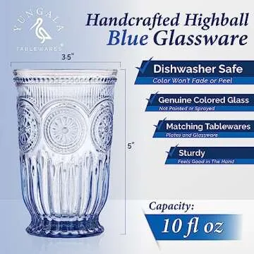 Yungala Blue Glass Tumblers set of 6 Highball glasses, Dishwasher Safe Blue Glassware made from Blue Glass, 6 colored drinking glasses