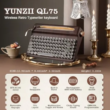 Show more Meet the YUNZII QL75 Wireless Typewriter Hot Swap Retro Mechanical Keyboard, the ultimate fusion of vintage charm and modern functionality. This extraordinary keyboard captivates with its nostalgic typewriter-style aesthetic, featuring elegant round keycaps and an ergonomic design with gradually ascending key heights for a comfortable typing experience. Its tri-mode connectivity—including Bluetooth, 2.4GHz wireless, and USB-C—ensures seamless integration with multiple devices, be it your tablet, smartphone, or computer. Enjoy the thrill of typing as you feel the rich tactile feedback of the hot-swappable switches, all while surrounded by a delightful RGB backlight that adds style and ambiance to your workspace.