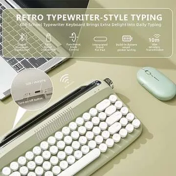 Show more Experience the perfect blend of nostalgia and modern technology with the YUNZII Upgraded Wireless Retro Keyboard. This exquisite keyboard brilliantly combines vintage charm with cutting-edge functionality, serving as an ideal companion for tech enthusiasts and retro lovers alike. With its pastel-colored design and round keycaps, this aesthetic keyboard not only elevates your workspace but also brings joy to every typing session.