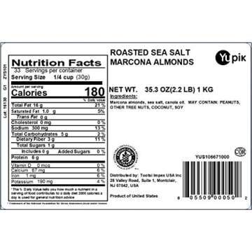 Show moreIntroducing the Yupik Roasted Sea Salted Marcona Almonds, your new favorite snacking sensation! These unique almonds, flatter and wider than standard almonds, boast a delightful crunch and a rich, savory flavor that’s sure to elevate any snacking occasion. Carefully roasted to perfection and lightly seasoned with sea salt, these Marcona almonds deliver that irresistible taste you crave while being a nutritious choice. Enjoy the perfect balance of indulgence and health with every handful of these Gluten-Free, Vegan, and Kosher whole nuts.