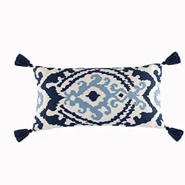 Show moreIntroducing the **Yurico Cotton Linen Throw Pillow Cover**, a stunning embodiment of vintage farmhouse charm and bohemian flair. This meticulously designed decorative pillowcase measures 12x24 inches (30x60 cm) and features a captivating blue retro pattern that instantly elevates your interior decor. Crafted from high-quality cotton and linen, this pillow cover is not only visually appealing but also incredibly durable and breathable, ensuring a comfortable experience whether used as lumbar support or merely as decor. The standout feature of this pillow cover is its exquisite embroidered pattern accompanied by delightful tassels at each corner, adding an extra touch of elegance and character to your space. The intricate embroidery provides a sophisticated texture that makes it look like a cherished find from a boutique home decor store.