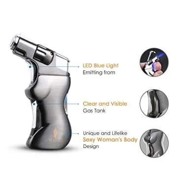 Show moreIntroducing the Yusud Fire Jet Cigar Torch Lighter, a stunning blend of artistry and utility designed to redefine your smoking experience. This unique torch lighter is not just a functional tool but a conversation starter, showcasing an exquisite form that mimics the curves of a lady's body combined with edgy pistol aesthetics. The innovative blue LED light adds an exquisite touch, illuminating the lighter and enhancing its charming appearance. Perfectly ergonomic, this petite accessory fits snugly into your hand, offering comfort and style like no other lighter can.