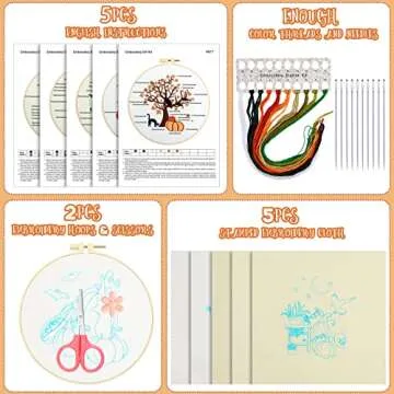 Show moreExperience the Joy of Crafting with the Yuxung 5 Sets Embroidery Kit designed specifically for beginners and adult craft lovers! This thoughtfully curated kit features everything you need to dive into the enchanting world of embroidery without the hassle. You'll receive five each of beautifully patterned embroidery fabrics showcasing classic fall designs, including pumpkins, maple leaves, and playful Halloween motifs like cats and bats. Each kit is packed beautifully, making it a perfect gift for yourself or anyone who appreciates the art of needlework.