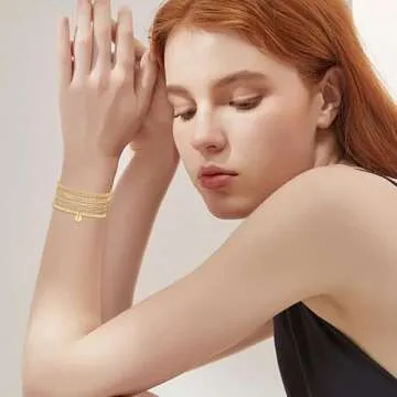 Show more Embrace elegance with the YWOYWO 5PCS Gold Bracelets Set, a perfect blend of style and personalization. Crafted from high-quality stainless steel and plated with 18K gold, this set features five distinct bracelets, including a chic small bean chain, a sturdy curb chain, a trendy paperclip link chain, an eye-catching figaro chain, and a delightful small beaded bracelet. Each piece is designed to be adjustable, providing a comfortable fit for everyone. With a total length of 8.85 inches, including a 6.89-inch main chain and a 1.96-inch extension chain, these bracelets can be tailored to perfectly suit any wrist size, making them a versatile addition to any jewelry collection.