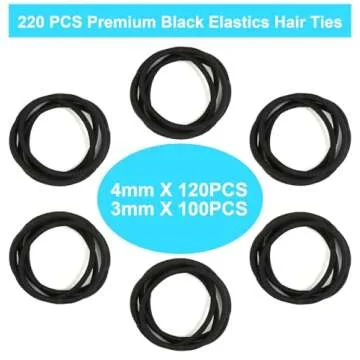 Show more Introducing the YXYL 220 PCS Black Hair Ties, the ultimate solution for all your hair styling needs, meticulously designed for both women and men. This comprehensive set includes 120 pieces of 4mm thick hair ties and 100 pieces of 3mm elastics, making it perfect for a variety of hair types and styles. Whether you're creating a sleek ponytail, intricate braids, or simply need to control your hair throughout the day, these hair ties promise a secure hold without sacrificing comfort. Each tie has a diameter of 2 inches, ensuring a snug fit that will keep your hairstyle intact no matter the occasion.