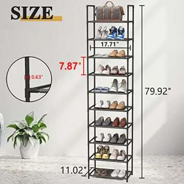 Show more Introducing the Z&L HOUSE 10 Tier Shoe Rack, your ultimate storage solution designed for modern living. This tall and sturdy free-standing narrow shoe rack not only elevates your shoe organization game but also transforms your space into a tidy and inviting environment. With an impressive capacity to store 20-24 pairs of shoes, it adapts beautifully to any small space, be it your entryway, closet, or any other room in need of optimized storage. Its sleek design, standing at an eye-catching height of 79.92 inches, makes it a statement piece while ensuring functionality is never compromised.