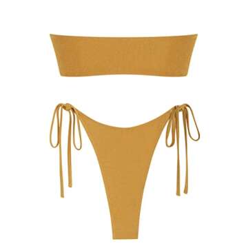 The eye-catching gold yellow hue adds a touch of luxury and glam to your beach day, ensuring you shine under the sun. This bikini set is ideal for women who love to make a fashion statement while enjoying the water. The bandeau top provides versatile styling options, whether you want to wear it with or without straps, making it a must-have addition to your swimwear collection.