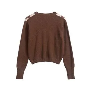 ZAFUL Women's Argyle Sweater Long-Sleeve V-Neck Plaid Knitted Crop Sweater Pullover Tops (3-Coffee, M)
