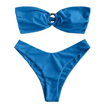 Show more Introducing the ZAFUL Women's Bandeau Bikini O Ring Strapless Tie Back High Cut Two Piece Swimsuit, a captivating blend of elegance and comfort that ensures you make a splash this summer. Designed for the fashion-forward beach lover, this bikini boasts top-notch **stretchy and breathable materials** that facilitate effortless movement, whether you're indulging in sunbathing, swimming, or hitting the beach bar. The eye-catching O-ring detail on the bandeau top enhances your curves and distinguishes your look, making it an essential piece in every summer wardrobe. With its unique tie back closure, you can adjust for a secure fit that prioritizes comfort for those sun-drenched days out.