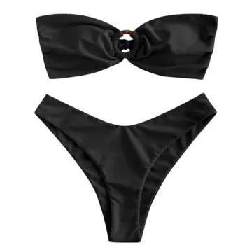 Show more Indulge in the ultimate beach-ready look with the ZAFUL Women's Bandeau Bikini O Ring Strapless Tie Back High Cut Two Piece Swimsuit. Made from comfortable, stretchy materials, this bikini is crafted to ensure ease of movement and an unmatched fit, giving you the confidence to soak up the sun and splash in the waves. The eye-catching bandeau top, featuring a chic O-ring detail and secure tie-back closure, allows for an adjustable fit that ensures both support and style. Its unique design is not just fashionable but practical, enabling you to enjoy all your water activities with grace and flair.