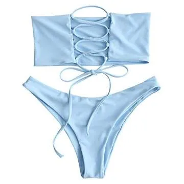 ZAFUL Women's Bathing Suit Adjustable Back Lace-up Bandeau Bikini Set (S, Light Blue)