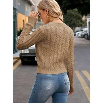 ZAFUL Women's Cable Cropped Sweater Long Sleeve Crewneck Pullover Knit Jumper Crop Top (1-Camel Brown, S)