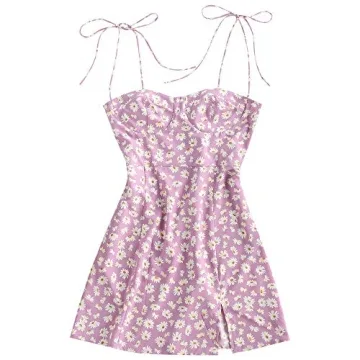 ZAFUL Women's Cherry Print Tie Shoulder Sleeveless Flare Beach Cami Mini Dress (Mauve, S)