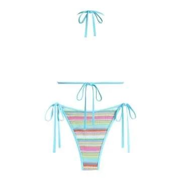 Show more Introducing the ZAFUL Women's Colorblock Stripes Triangle Halter Tied Cheeky Thong Bikini Set—the ultimate addition to your summer wardrobe! Crafted with precision from high-quality, stretchy fabric, this bikini set effortlessly hugs your curves, ensuring both comfort and style. The unique color block design adds a trendy twist, perfect for making a bold statement at the beach or poolside. Fitted with a chic halter neck, this bikini top not only provides great support but also highlights your neckline beautifully. With back ties allowing for a customized fit, you can be assured of style and security in every splash!