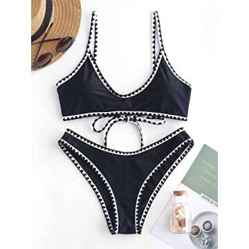 ZAFUL Women's Contrast Trim Piping Crochet High Cut Tie Back Bralette Bikini Set (2-Black, S)