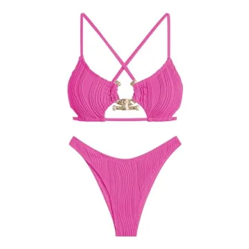 Show more Step into summer with style and confidence in the ZAFUL Women's Cutout Bikini Criss Cross Textured Metal High Leg Bikini Sets. This stunning two-piece swimsuit features a unique cutout design and a stylish criss-cross detail that is sure to turn heads at the beach or poolside. Crafted from premium quality textured fabric, it offers a soft and comfortable wear while ensuring durability for countless sun-soaked adventures. The high-leg cut enhances your natural silhouette, giving you that perfect beach body look without compromising on comfort.