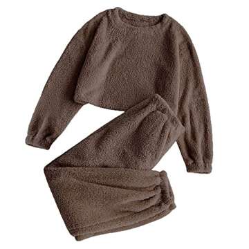 ZAFUL Women's Fuzzy Lounge Casual Pajamas Sets Fleece Pullover and Pants Set 2 Piece Fluffy Loungewear Sleepwear Brown