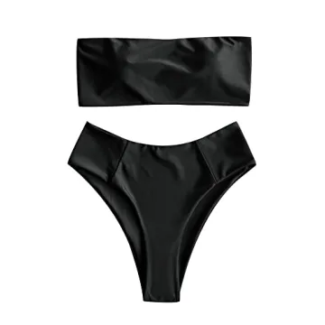 ZAFUL Women's High Cut Bandeau Bikini Set Strapless Solid Color 2 Pieces Bathing Suit Swimsuit (0-Black,S)