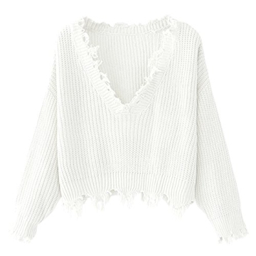 ZAFUL Women's Loose Long Sleeve V-Neck Ripped Pullover Knit Sweater Crop Top in White