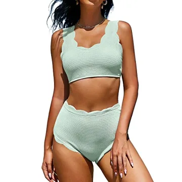 ZAFUL Women's Scalloped Textured Swimwear High Waisted Wide Strap Adjustable Back Lace-up Bikini Set Swimsuit Mint Green 2XL