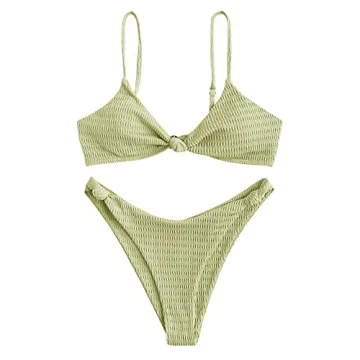 ZAFUL Women's Solid High Cut Cheeky Textured Twisted Knot Bikini Set Two Piece Swimsuit (3-Green, S)