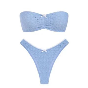 Show moreIntroducing the ZAFUL Women's Strapless Bikini, a statement piece designed for women who cherish both style and comfort. Crafted from a luxurious blend of 85% polyester and 15% spandex, this bikini set boasts a soft, stretchy, and breathable fabric, making it ideal for sunny days by the water. The unique bandeau design features an exquisite lace trim and a chic bowknot detail, which not only adds a touch of elegance but also ensures that you stand out effortlessly. With its crisscross back tie, this bikini stays securely in place while allowing you to enjoy your beach activities without worrying about slipping. The high cut bottoms showcase a flattering low-waisted design with stylish tie side strings, accentuating your figure while providing a cheeky and trendy look. Whether you're lounging by the pool or hitting the waves, this swimsuit delivers a modern silhouette that exudes confidence.