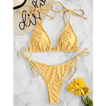 Unveil your beach-ready style with the ZAFUL Women's String Swimsuit Tie Dye Halter Ribbed Polka Dot Bathing Suit Bikini Set. This stunning bikini set combines playful design with exceptional comfort, perfect for sunbathing and splashing in the waves. The striking tie dye pattern and classic polka dots make this two-piece a standout choice for summer, giving you an effortlessly chic look. The ribbed texture adds a touch of sophistication to the playful design, ensuring you not only feel great...