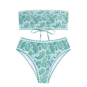 ZAFUL Women Strapless Textured Bandeau Bikini 2 Piece Swimwear Cheeky Solid Lace up Bathing Suits(8-Green Print,M)