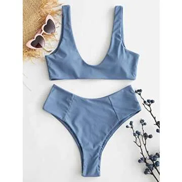 ZAFUL Womens High Cut Wire Free Scoop Padded Side Boning Bikini Set Two Pieces Swimsuit,(Blue Gray,S)