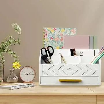 Show moreIntroducing the ZALIOJI Wooden Desk Organizer – a sophisticated and stylish solution designed to transform your workspace! This elegant mail organizer boasts a chic white and gold color scheme that seamlessly integrates functionality with a touch of refined aesthetic. Measuring compactly to fit snugly on your desktop, it features ample storage capabilities that ensure your letters, bills, and office supplies remain organized and easily accessible. Crafted from high-quality materials, this desk accessory is built to withstand the rigors of daily use while maintaining its chic appeal.