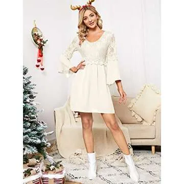 ZANZEA Women's Vintage Floral Lace V Neck 3/4 Bell Sleeve Cocktail Wedding Party A-line Swing Casual Mini Dress Beige L