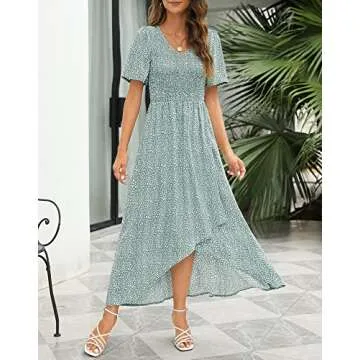 Zattcas Womens 2023 Smocked Maxi Dress Short Sleeve Vneck Casual Summer High Low Flowy Long Dress
