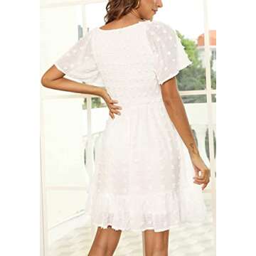Show moreIntroducing the Zattcas Women’s Swiss Dot Smocked Mini Dress—the ultimate blend of comfort, style, and versatility for your spring and summer wardrobe. This enchanting dress is made from a lightweight, chiffon swiss dot fabric that is not only smooth and airy but also fully lined, ensuring that it remains non-transparent for all occasions. Whether you’re attending a bridal shower, graduation, or enjoying a casual day out, this charming mini dress features a sexy V neckline, short flutter sleeves, and a beautifully ruffled hem that flatters every figure. Its stretchy smocked bust provides comfort through its forgiving fit, making it suitable for all body types. Say goodbye to compromising on style for comfort, as this dress offers both!